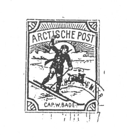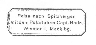 Diese Stempel sind als Doppelkreisstempel mit Mittelsteg ausgeführt, wobei im oberen Teil das Fahrgebiet Spitzbergen oder Nördliches Eismeer und im unteren Teil der Anlaufort z.B. Bären – Insel für Nördliches Eismeer und Nordküste für Spitzbergen aufgeführt wurden. Eine derzeitig nachweisbare Verwendungsdauer reicht von 1896 bis 1908.Dies besagt, dass auch Axel Bade auf diese Stempel zurückgegriffen hat. Vignetten Ab 1897 wurde auf Spitzbergen das erste Saisonpostamt eröffnet und für die abgehende Post nach Norwegen mussten dessen Briefmarken verwendet werden. Die davor geführten Lokalpostmarken in einer Poststelle des Hotels am Adentfjord haben W. Bade wohl auch angeregt, solche Vignetten drucken zu lassen. Diese wurden bei einer Auflage von je 1000 Stück in drei verschiedenen Auflagen gedruckt. Für die Reise von 1897 wird die erste der Vignetten zum Einsatz gebracht ( Abb. 1 ). Im Jahr 1898 bringt W. Bade die zweite seiner Vignetten zum Einsatz. Die bildliche Darstellung zeigt jetzt ein Walroß und man muss hier bei diesen Vignetten von den Typen 1 und 2 sprechen, denn bei dem Wort Polarpost ist bei einer Auflage ein Bindestrich gesetzt. Die nächste Vignette lässt W. Bade 1903 drucken. Das benutzte Bild weist wieder ein Walroß auf, aber zum Unterschied der zuvor geführten Vignetten sind diese auf weißem Papier gedruckt und auch der Hintergrund weist minimale Unterschiede auf. Bildpostkarten Diese Postkarten werden an Bord verkauft und stellen somit eine zusätzliche Einnahmequelle für W. Bade da. Die meisten der verwendeten Karten sind auf der Vorderseite farblich mit polaren Motiven gestaltet. Bei den verwendeten Karten muss man von drei verschiedenen Varianten ausgehen.